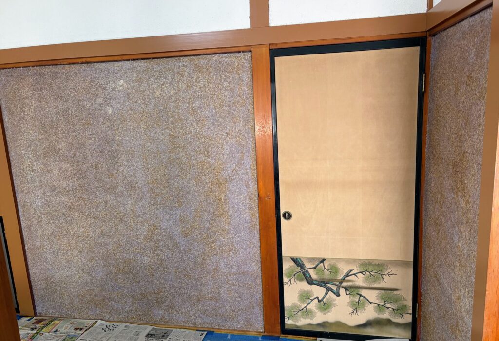 壁は昔ながらの『繊維壁』。このままでは塗装できないので、下地処理をします。