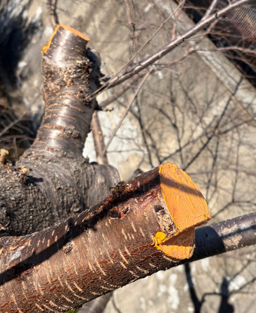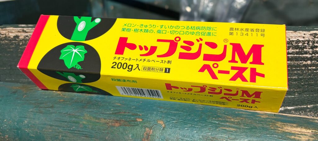 今回、太い枝を2か所切ったので、細菌等が入らないように殺菌塗布剤を塗っておきます。